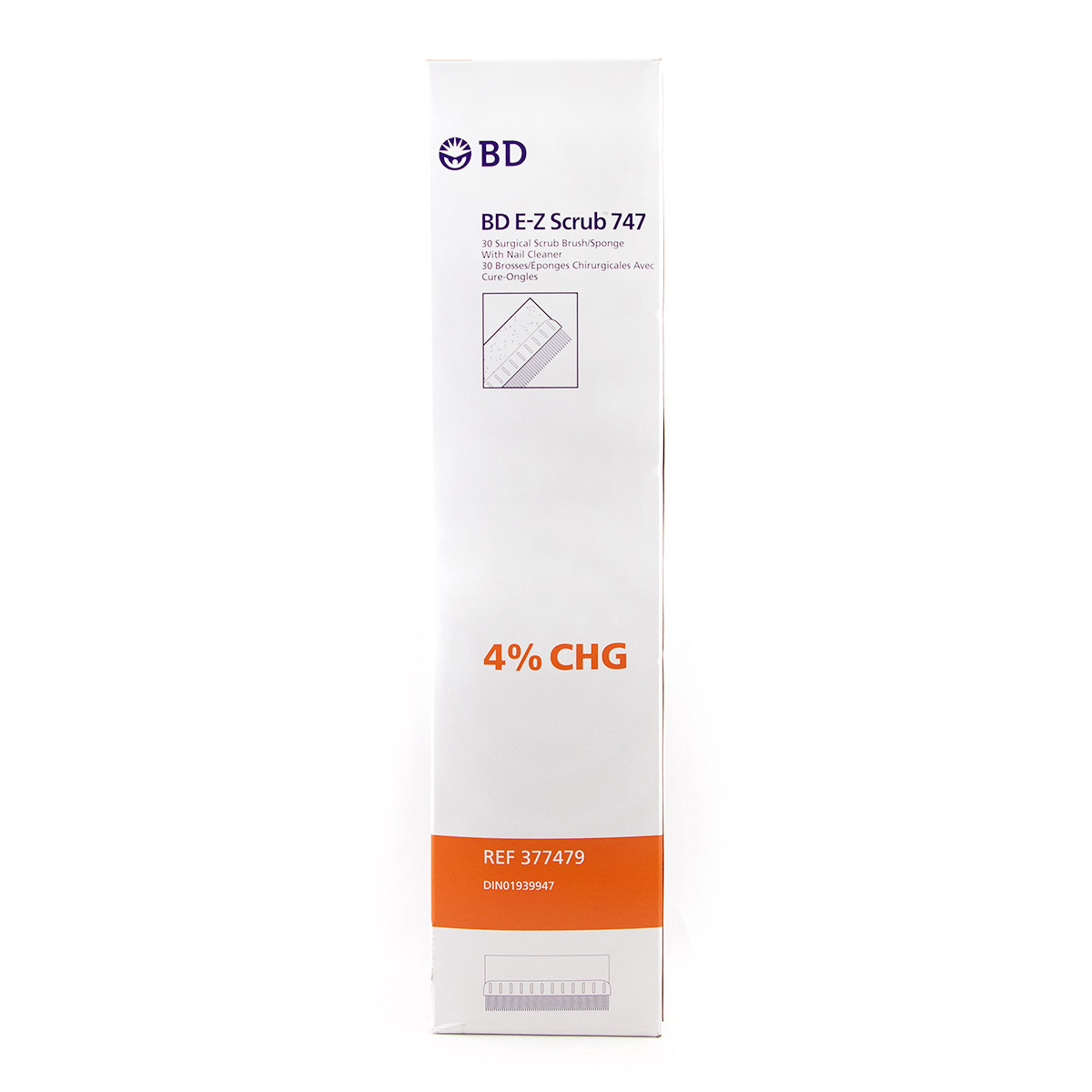 BD E-Z Scrubâ„¢ surgical scrub brush impregnated with 4% CHG. Color coded red. (30/sp, 300/ca) BD E-Z Scrubâ„¢ Preoperative Surgical Scrub Brushes For over three decades, the BD E-Z Scrub brand has been considered the "gold standard" in single-use disposable scrubs. BD E-Z Scrub products offer a wide range of efficacious antimicrobial formulations specifically designed to enhance performance while reducing irritation to the skin. Product line includes popular and efficacious antimicrobial formulations, including CHG, PCMX, and Povidone Iodine. Proprietary polyethylene soft bristles enhance mechanical action while reducing skin irritation. Soft sponge provides gentle cleaning on irritated areas or when firm mechanical action is not required. Ergonomic brush design allows greater user comfort and effectiveness, ultimately improving compliance.
