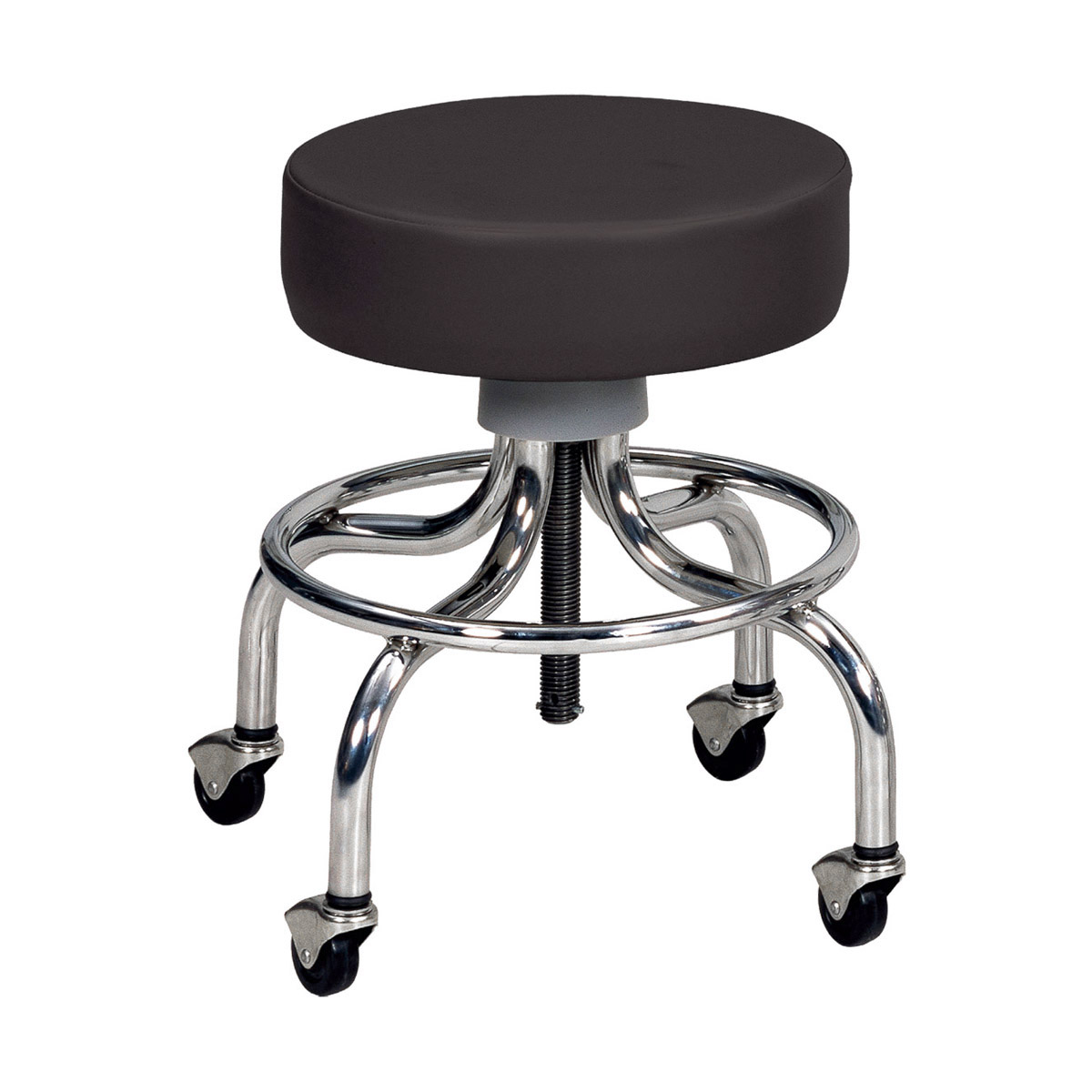 Fitted with a 14" diameter seat padded with 41/2" foam. Stain resistant upholstery allows easy cleaning. The seat height is adjustable with a smooth machine screw ranging from 19"–25", on a solid steel shaft. The 1" tubular frame and round foot ring is completely chromed (including the welds). Rolls on 2" vinyl casters